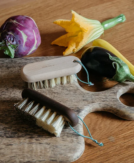 Zaoblená rukoväť kefky je vyrobená z bukového dreva napusteného včelím voskom (svetlá kefa) a z tepelne ošetreného jaseňového dreva (tmavá kefa). Vďaka včeliemu vosku a tepelnému ošetreniu rukoväť kefy odoláva aj vlhkému prostrediu pri kuchynskom dreze. Má ideálnu veľkosť, takže dobre padne do ruky a môžete ju aj zavesiť, aby bola vždy po ruke.
