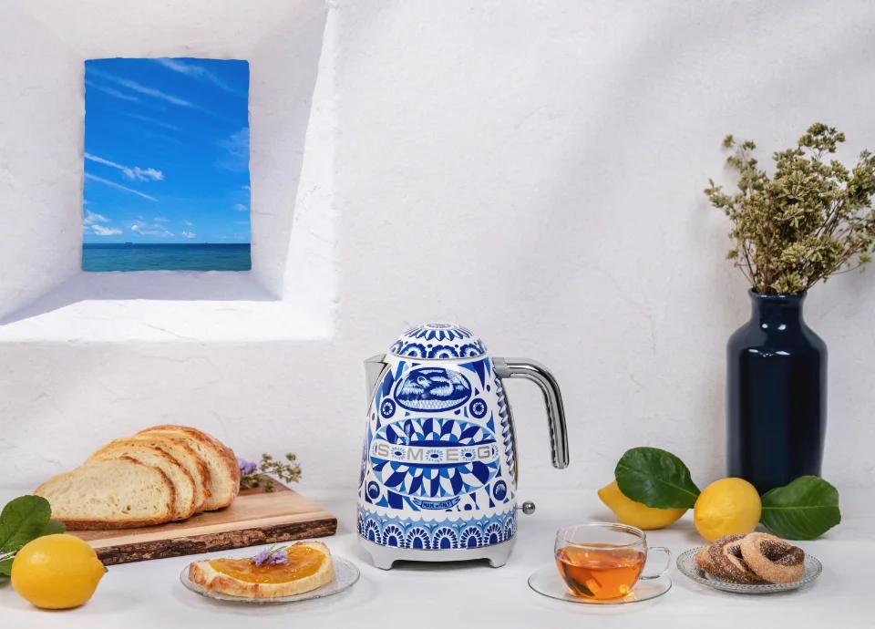Rýchlovarná kanvica v hravom designe 50. rokov, oblečená do kabátika návrhárskeho dua Dolce & Gabbana. Súčasť novej kolekcie Blu Mediterraneo.