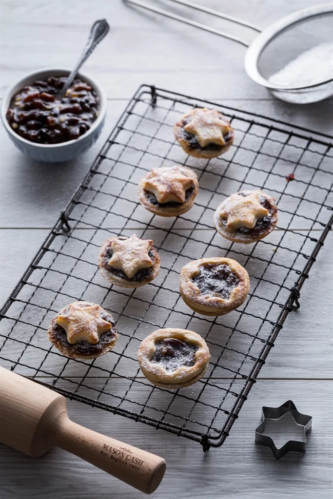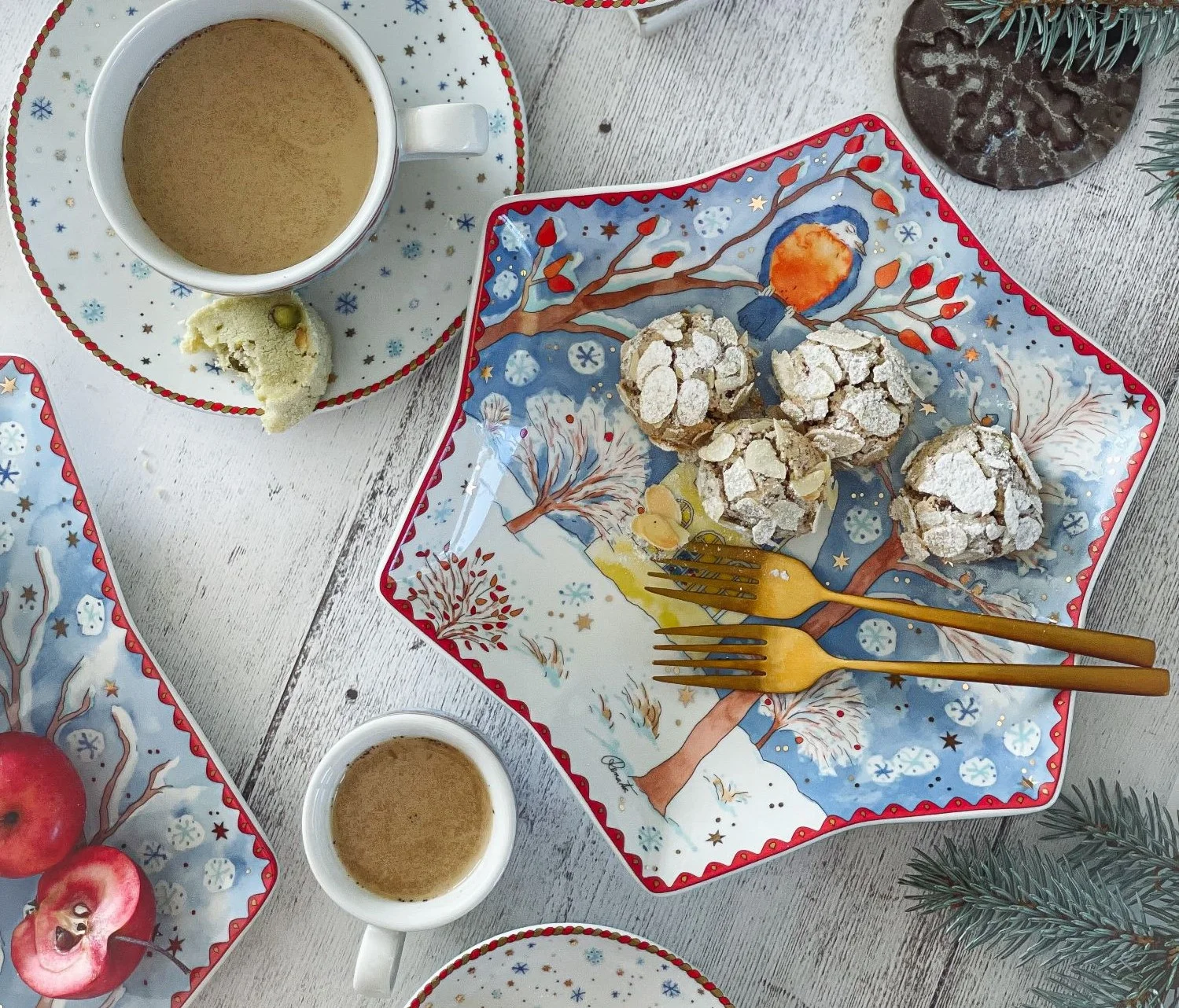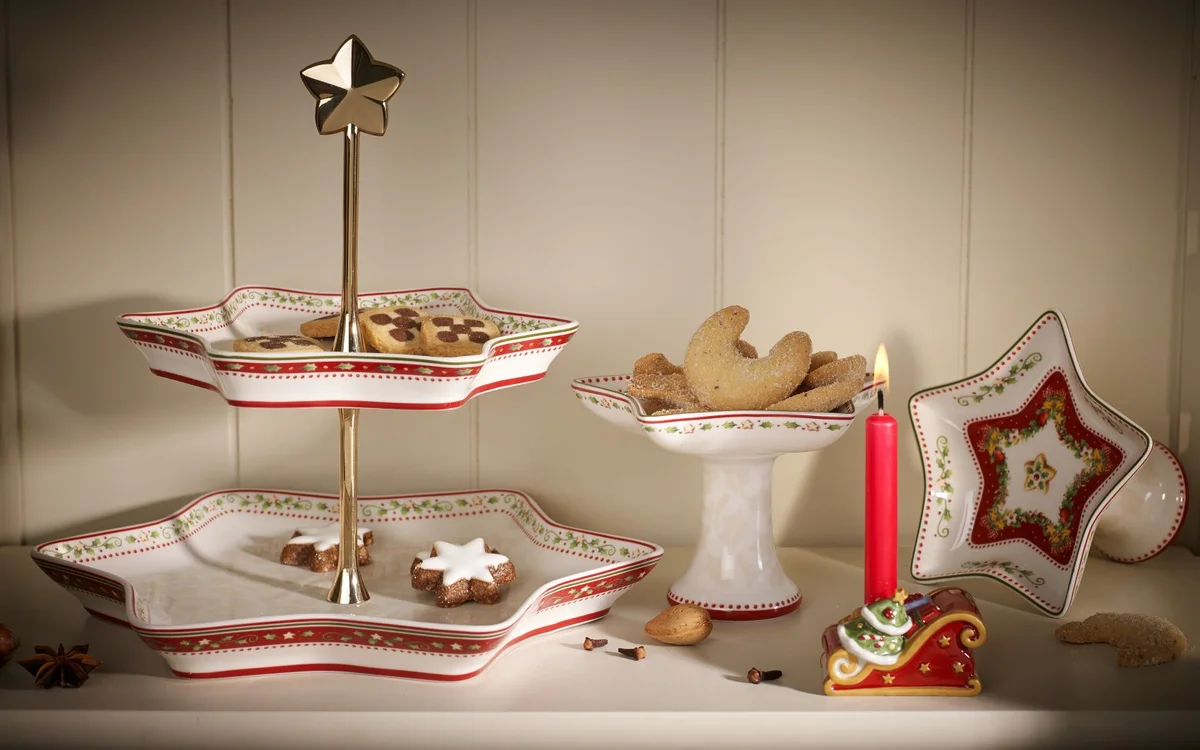 Keď sú už cukrovinky ozdobené, zaslúžia si čestné miesto na sviatočnej tabuli. Nie je nutné kupovať kompletnú servírovaciu sadu k tomu, aby sa jednotlivé druhy na stole vynímali čo najlepšie. Vystačíte si s dvojposchodovým etažérom Winter Bakery Delight, ktorý je na efektívne servírovanie priamo predurčený. Taniere z prémiového porcelánu v tvare hviezdy zdobí motív cezmíny a červeno-zelené linky, vianočnú atmosféru tak umocní kovová hviezda na vrchole.