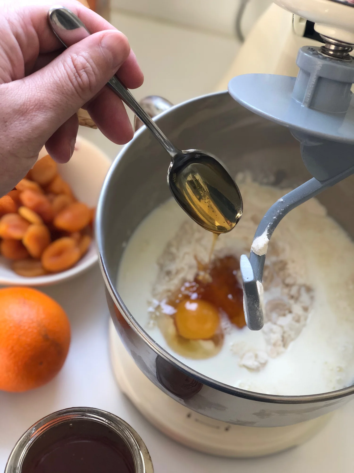 1. Do misy na prípravu cesta pridajte všetku múku, rozdrobené droždie a zalejte vlažným mliekom. Potom pridajte med, cukor, soľ, nastrúhanú pomarančovú kôru, vajce a korenie. Všetko dobre premiešajte. Nakoniec pridajte do cesta kúsky zmäknutého masla a hneťte do hladka.