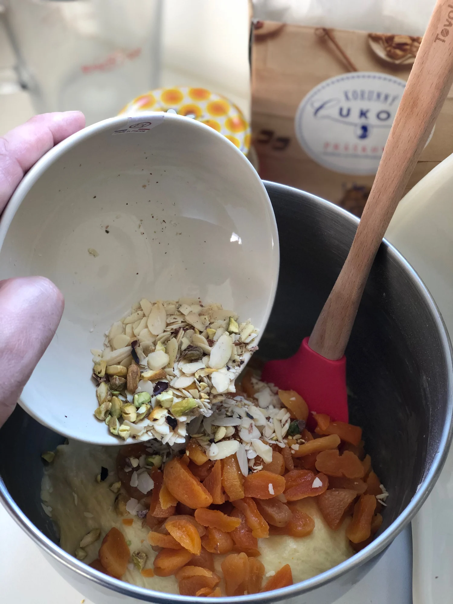 3. Do hotového cesta úplne nakoniec nasypte marhule a nasekané pistácie.
