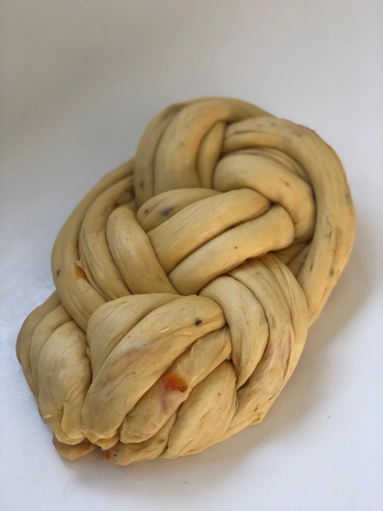- Výsledný vrkoč zmotajte dokopy do tvaru gule a nechajte na plechu s papierom na pečenie ešte chvíľku, cca 5-10 minút vykysnúť.