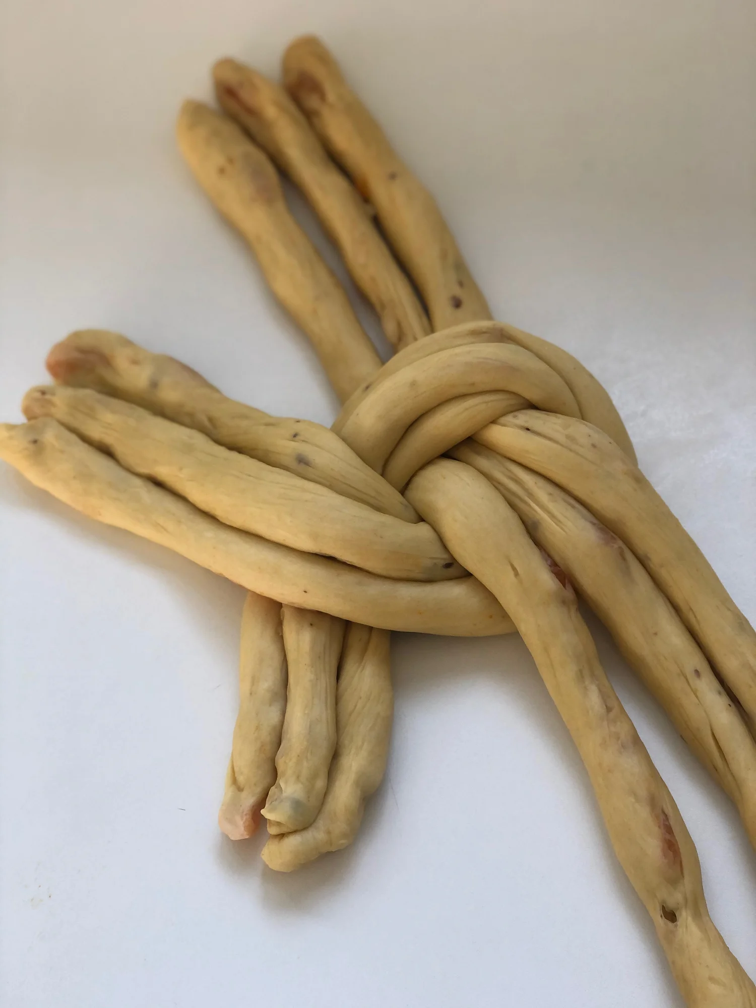 - Vykysnuté cesto rozdeľte na 6 rovnako veľkých dielov a vyvaľkajte na pramene.