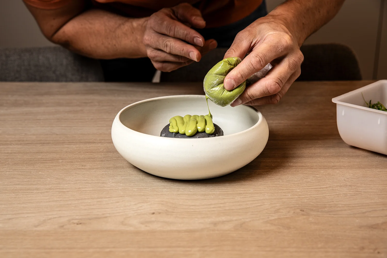 Ak máte nachystané všetky zložky dezertu a hostia sú za dverami, môžete sa pustiť do kompletizácie dezertu. Na rozdiel od presných cukrárskych postupov sa pri prezentácii môžete úplne odovzdať vlastnej fantázii. Pridajte farebné jedlé kvety a drobné bobuľové ovocie pre pestrosť, k zelenej matcha ganache sa budú hodiť perfektne.