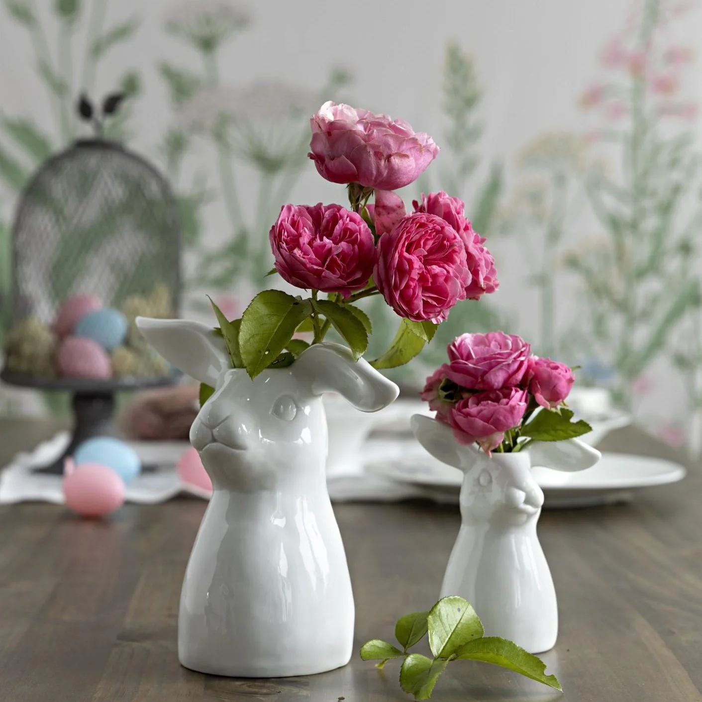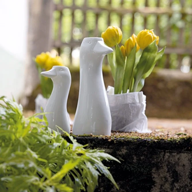 Realisticky vyvedené, avšak súčasne štýlovo veľmi jednoduché porcelánové vázy, z ktorých prinajmenšom dve humorným spôsobom evokujú jarný a veľkonočný čas. Ich snehovo biela farba len zvýrazní veselé a žiarivé farby jarných kvetov a pučiacich vetvičiek, ktoré do nich umiestníte, bez toho, aby tlmili ich kúzlo. Vtipné prevedenie každej z váz osvieži akýkoľvek interiér sám o sebe. Vázy v tvare zajačej alebo husej hlavy či sediacej mačky sú k dispozícii v dvoch prevedeniach, ktoré sa líšia len výškou.