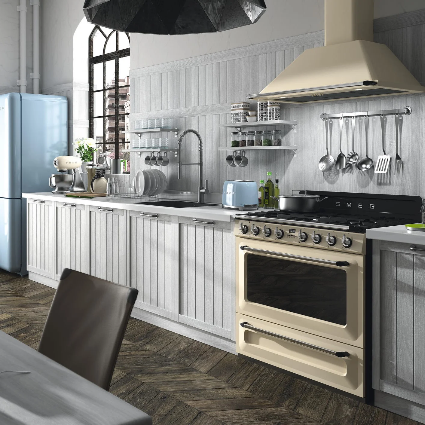 Designová rada Victoria bola inšpirovaná výraznými prvkami prvého sporáku, ktorý v roku 1984 spoločnosť Smeg vyrobila. Nezvyčajná elegancia retrodesignu vás prenesie do dôb dávno minulých, kedy čas plynul v pomalšom tempe a kuchyňa bola kotvou, kde prežitok z dobre pripraveného jedla spájal všetkých spoločne sediacich za stolom. Keď svet stráca svoje istoty, kedy inokedy ich nájsť, než v hrejivo, ľahkej nostalgickej kuchyni ...