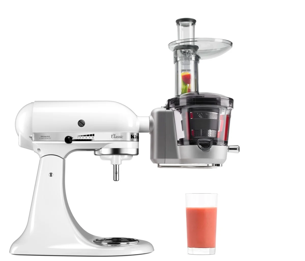 Doprajte si zdravú ovocnú či zeleninovú šťavu kedykoľvek na ňu dostanete chuť. Využite excelentný výkon vášho robota a premeňte ho na výkonný odšťavovač. Nízkootáčkový odšťavovač je doplnkovým príslušenstvom, ktorý je kompatibilný so všetkými typmi kuchynských robotov KitchenAid.