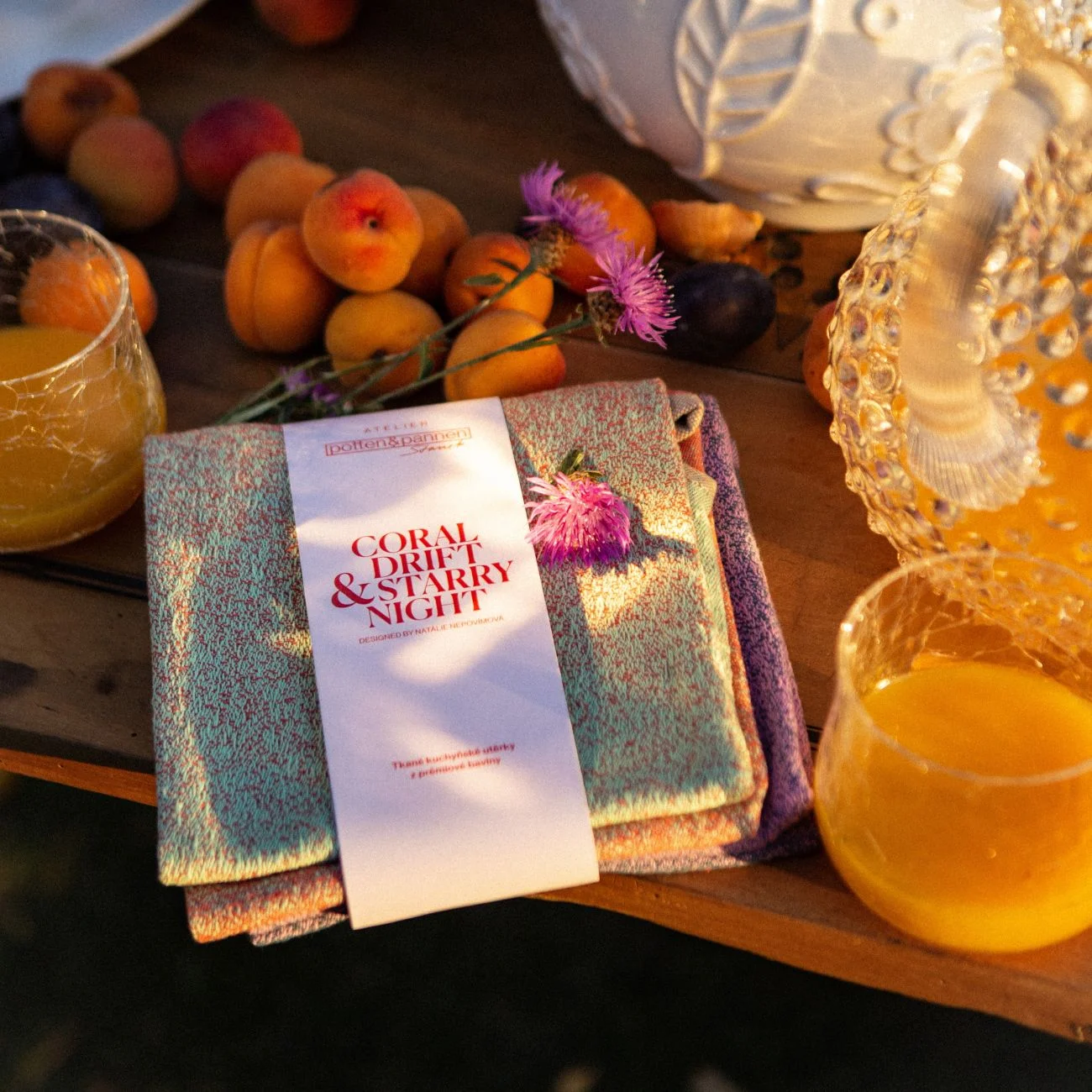 Inšpiráciou sa stali kontrasty prírody, žiarivé oranžovo-tyrkysové odtiene pripomínajúce korálové útesy a hlboké tóny fialovej a tmavomodrej evokujúce nočnú oblohu posiatu hviezdami. Natália túto atmosféru preniesla do jemných farebných štuktúr, ktoré pôsobia súčasne energicky aj harmonicky. Každý kus je vyrobený z prémiovej bavlny, vyniká vysokou savosťou a odolnosťou. Každá utierka je doplnená dvomi praktickými pútkami a autorskou visačkou.
