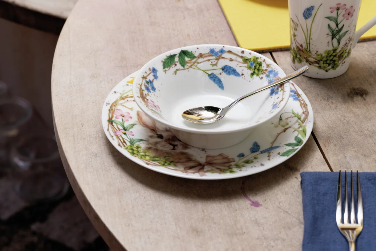 Tanier je vyrobený z mliečne bieleho kostného porcelánu, jeho vlnkovaný okraj je zdobený ilustráciou kvetín, kvitnúcich počas jari a hlavou ušiaka, ktorý zvedavo narába uškami. Porcelánový tanier s priemerom 22 cm môžete použiť nielen ako plytký jedálenský tanier, ale tiež ako prílohový či tanier na dezerty alebo pečivo. Okrem neho je súčasťou kolekcie polievkový hlboký tanier s priemerom 24 cm, veľký tanier s priemerom 28 cm, ktorý je možné zakladať aj ako klubový tanier alebo používať ho ako servírovací. Samozrejme nechýba ani malá miska s priemerom 15 cm a veľký hrnček s objemom 400 ml.