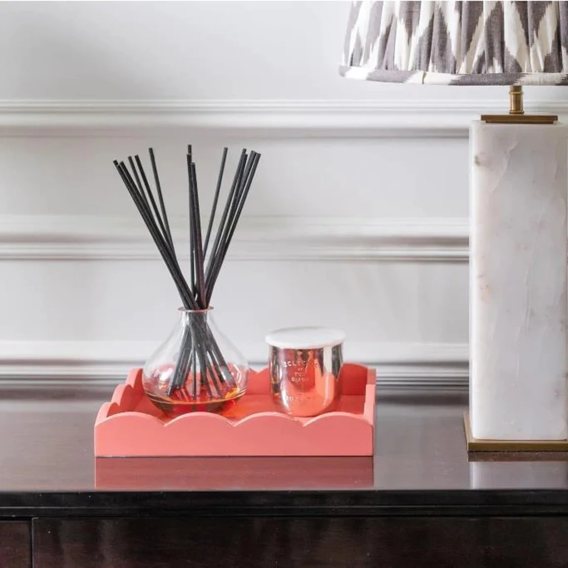 Hravý design s vlnitými okrajmi a sýta farba okrúhleho podnosu exkluzívnej britskej značky Addison Ross si vás získa svojím prevedením. Vyrobený bol z drevovláknitých dosiek, ktoré sú ideálne pre interiérové dekorácie či nábytok. Tento pevný a odolný materiál je hladký a je možné ho pomerne dobre spracovávať, čo je ideálna kombinácia pre dokonalé rovné ci oblé tvary a hladký povrch. Dno podnosu bolo opatrené béžovým zamatom a logom značky. Vďaka dvadsiatim vrstvám laku a ručnému lešteniu medzi každým lakovaním je krásne lesklý. Jeho priemer s veľkosťou 20,5 cm je vhodný aj pre väčšie domácnosti či udalosti. Samozrejme ho môžete použiť aj ako dekoratívny prvok do vášho interiéru.