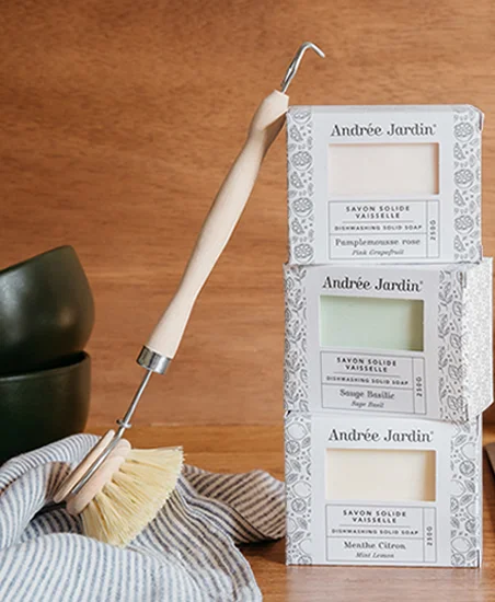 Kefa na umývanie riadu od Andrée Jardin je vyrobená zo 100% prírodných materiálov. Má drevenú rukoväť z bukového dreva. Vymeniteľná hlava kefy má neabrazívne rastlinné vlákna a odstráni aj odolné nečistoty bez poškodenia riadu.
