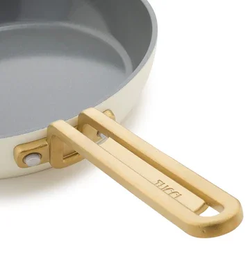Tepelne odizolovaná rukoväť z nehrdzavejúcej ocele sa pri používaní neprehieva. Jej matná zlatá farba s povrchovou úpravou PVD panvicu doslova rozžiari. Reverzne aplikované nity zaručujú nielen pevné uchytenie rukoväte, ale aj dokonale hladký vnútorný povrch panvice, na ktorom neulpievajú zvyšky jedla. Farebnosť panvice je inšpirovaná domovom Stanleyho Tucciho a jeho osobným štýlom a vkusom.