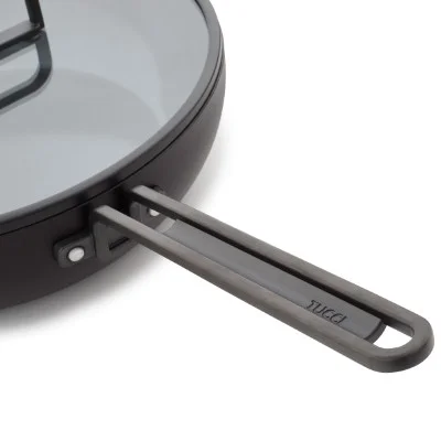 Tepelne odizolovaná rukoväť z nehrdzavejúcej ocele sa pri používaní neprehieva. Jej matná čierna farba s povrchovou úpravou PVD dokonale ladí s minimalistickým dizajnom hlbokej panvice v odtieni „Milano Black“. Reverzne aplikované nity zaručujú nielen pevné uchytenie rukoväte, ale aj dokonale hladký vnútorný povrch panvice, na ktorom neulpievajú zvyšky jedla. Farebnosť panvice je inšpirovaná domovom Stanleyho Tucciho a jeho osobným štýlom a vkusom.