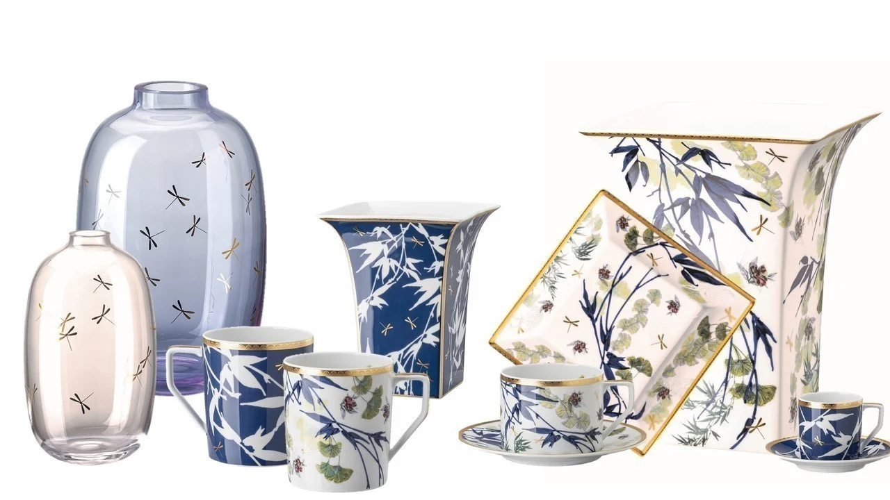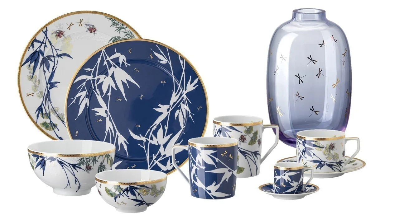 Pri bielej časti porcelánovej zostavy nájdete graficky čisté, realisticky vyvedené kvetinové zdobenie v jemných farbách, ktoré společne s poletujúcimi zlatými vážkami len mierne prekrývajú okraje taniera, alebo pokrýva celý hrnček či šálku. Dynamický prvok do kompozície vnášajú bambusové výhonky, vyvedené v temno modrej farbe; celkový dojem ešte podtrhuje zlatý okraj s rytými ornamentami. Modrá časť je naopak zdobená takmer po celom svojom povrchu, okrem zlatých vážok na nej nájdete už len výhonky bambusu v negatívnom, teda bielom, prevedení. Celkovo veľkolepý dojem umocňuje opäť zlatý okraj s drobnými rytinkami.