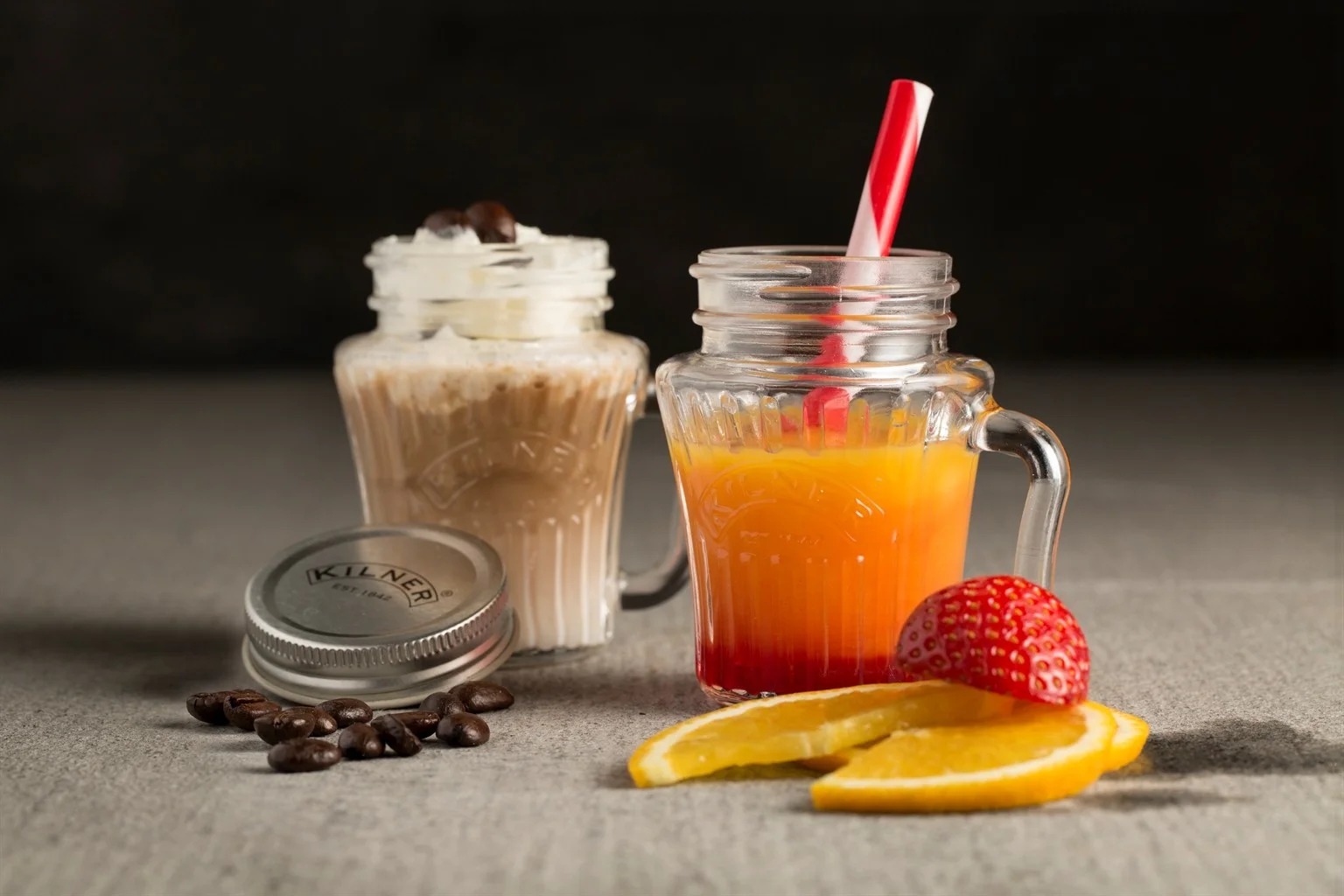 Sada 4 sklenených džbánkov Kilner na osobitný spôsob servírovania nápojov pri záhradnom barbecue. Prakticky a pritom štýlovo môžete servírovať ľadový čaj, pivo, domáce limonády, ale aj koktejly.
