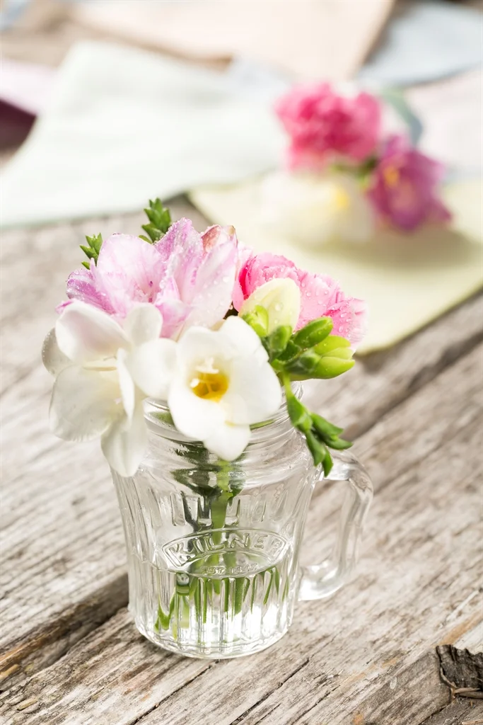 Pohár ma hore šikovný závit, na ktorý možno nasadiť dekoratívne viečko s otvorom pre slamku. Prekvapivo ho ale využijete nielen na pitie. Sklenený súdkovitý džbánok, zdobený fazetkou, totiž veľmi ľahko premeníte na netradičnú vázu alebo ho pri usporadúvaní detskej párty využijete napríklad na podávanie drobných sladkostí.
