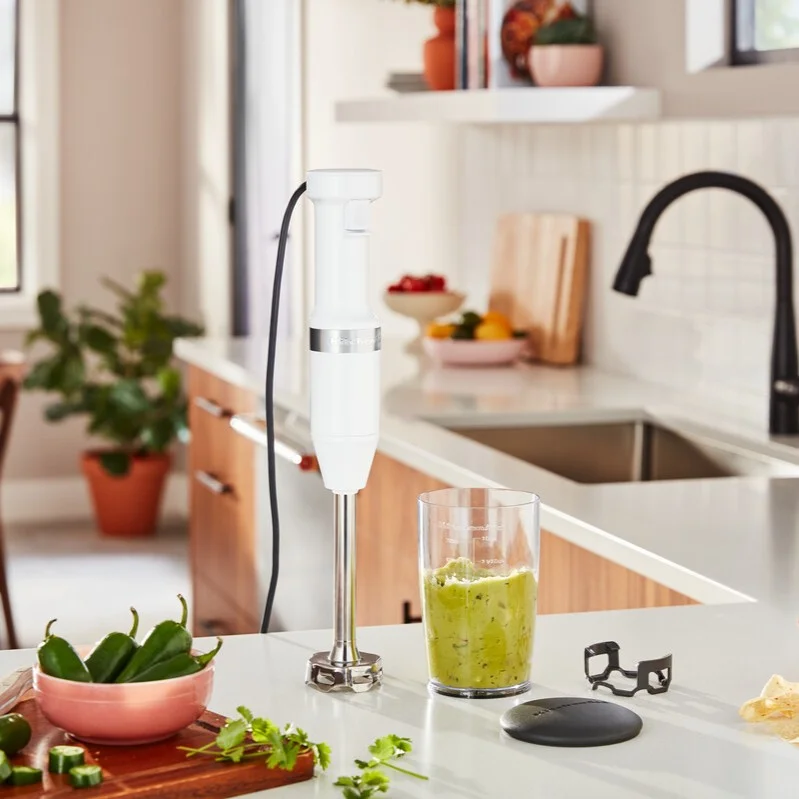 Univerzální tyčový mixér KitchenAid s lehkou konstrukcí lze snadno ovládat pouze jednou rukou. Praktická a dostatečně dlouhá odnímatelná mixovací tyč se 4bodovým nožem z nerezové oceli, se kterým rozmixujete polévky, omáčky či podrtíte led do koktejlů. Aby se zabránilo poškrábání nádobí, je mixér vybaven ochranným krytem. Variabilní úrovně rychlostí nabízejí větší flexibilitu a kontrolu nad výsledkem.