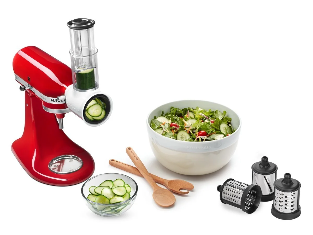 KitchenAid Artisan Veggie set obsahuje kuchynský robot Artisan KSM125 vo farbe kráľovská červená a nadstavce na spracovanie čerstvej zeleniny – 3 krájače a strúhadlá. Zostava, ktorá skutočne uspokojí všetkých milovníkov zeleniny, nielen vegetariánov či vegánov.