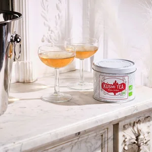 Bio organický biely čaj od Kusmi Tea - White Bellini s opojnou ovocnou vôňou broskýň a marhúľ.