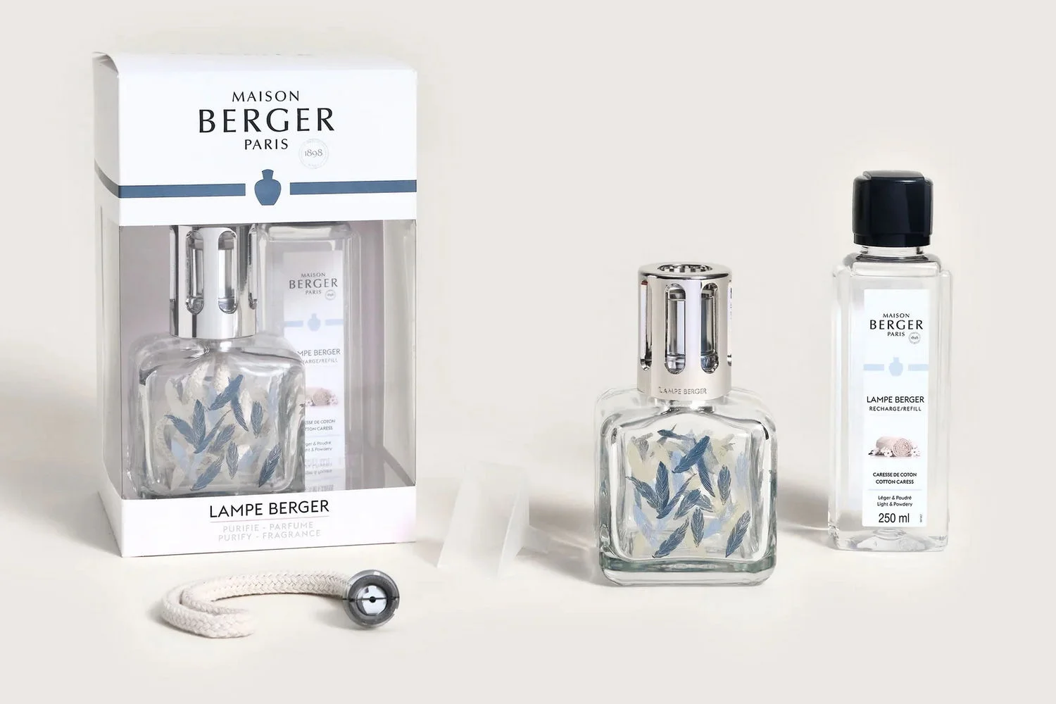 Darčeková sada pre pohodlný začiatok s lampami a parfumami Maison Berger Paris obsahuje katalytickú lampu Glacon z priehľadného skla dekorovanú jemnými pierkami a interiérový parfum Bavlnená starostlivosť s objemom 250 ml.