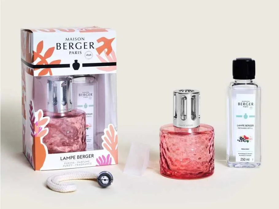 Darčeková sada pre pohodlný začiatok s lampami a parfumami francúzskej značky Maison Berger Paris obsahuje katalytickú lampu Mirage z ružového skla a interiérový parfum Svieža atmosféra s objemom 250 ml.