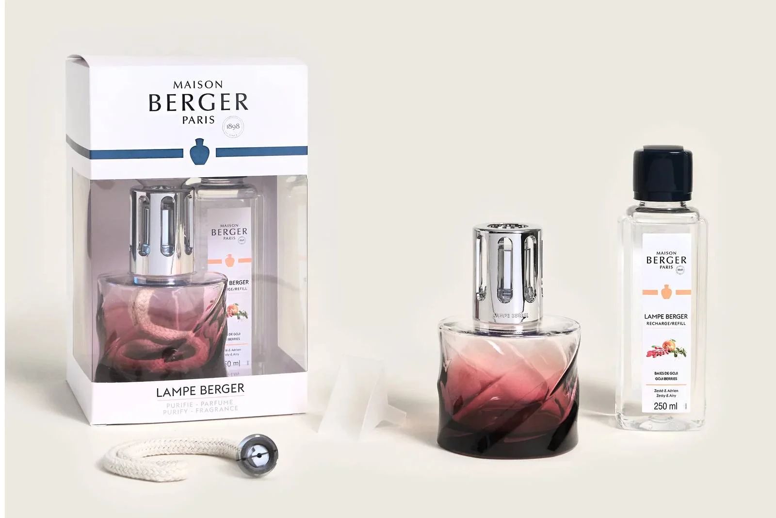 Darčekové balenie je ideálne pre jednoduchý úvod do sveta interiérových parfumov a katalytických lámp vychýrenej francúzskej značky Maison Berger Paris. Obsahuje totiž jednak katalytickú lampu Spirale v červenom prevedení, a tiež aj 250 ml interiérového parfumu Bobule goji. Súčasťou balenia je tiež patentovaný kahan s bavlneným knôtom, uzáver lampy a robustná ochranná korunka.