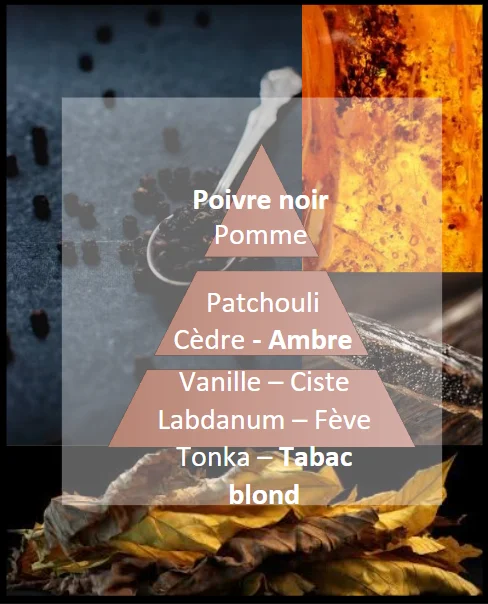 Očarujúci parfum, ktorý vás zavedie do slnkom vyhriatej krajiny s orientálnym nádychom. Jeho jantárové tóny vás prenesú do zmyselného a upokojujúceho sveta, ktorý postupne odhaľuje nádych svetlého dymu.