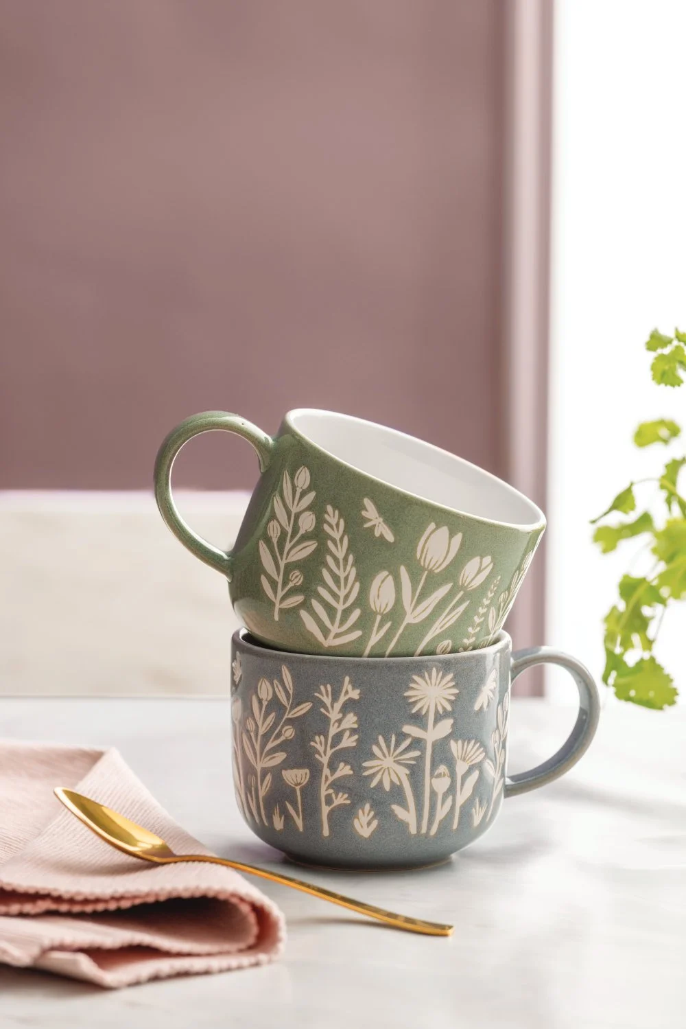 Veľký šedozelený hrnček z britskej kameniny Mason Cash s hlavným motívom tulipánov a lúčných kvetín, objem 0,4 litra. Novinka leta roka 2023, súčasť "kvetinovej" kolekcie In the Meadow, v ktorej si nájde tú svoju misu či misku každý vášnivý pekár...