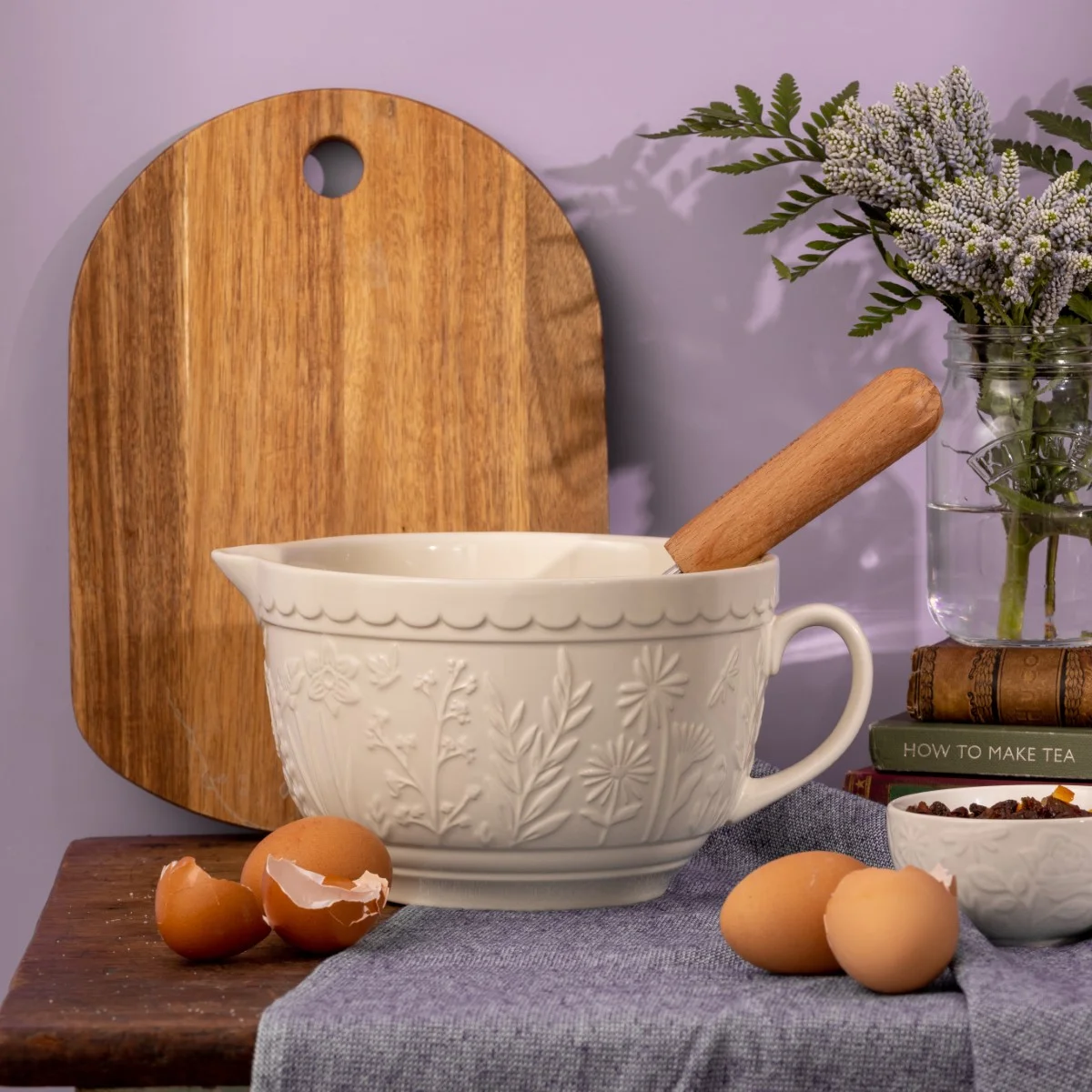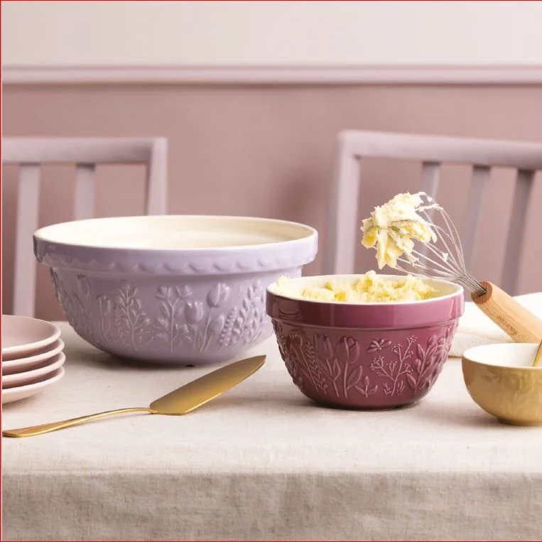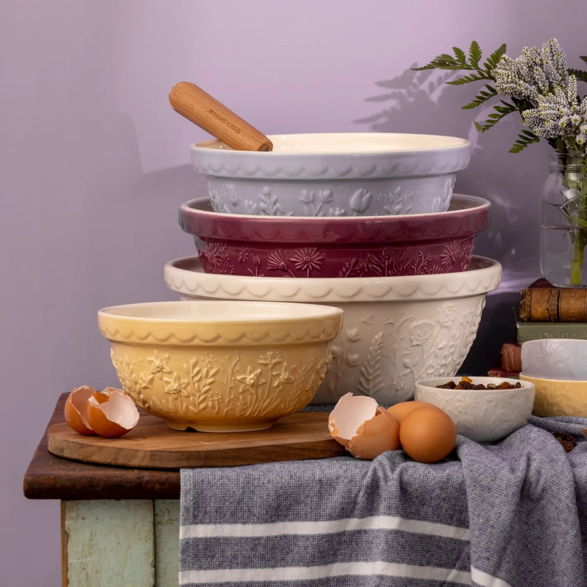 Kolekciu tvorí 3 misy na cesto Mason Cash s reliéfnými kvetinovými vzormi v krémovej, svetlo žltej a netradičnej purpurovej, rovnako ako v morskej kolekcii Nautical opäť kameninová misa s uchom (batter bowl) a so zlievacím zobáčikom, tentokrát v tradičnej krémovej farbe a sada 4 malých, viacúčelových misiek v jemných pastelových farbách.