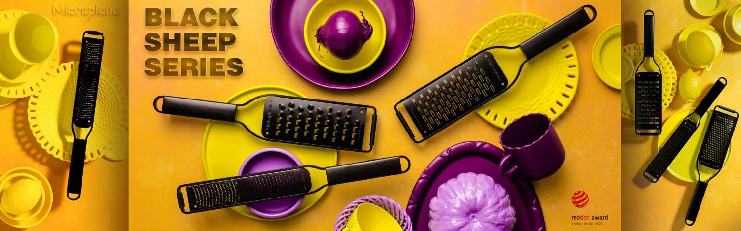 Kolekce Black Sheep s oceněním Red Dot Award: Product Design 2022 je stylová, elegantní a silná! Kolekce struhadel je celá v nadčasové a moderní černé barvě. Od rukojeti, přes rám, až po čepel - doslova "must-have" pro všechny gurmány, milovníky designu, kuchařské rebely a všechny, kteří ocení něco jedinečného.