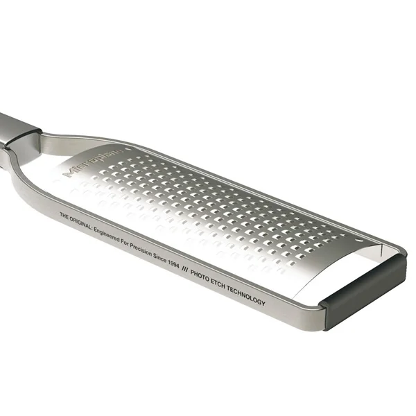 Pevný oceľový rám obopína celé strúhadlo a vytvára tak kompaktný celok. Samotné ostrie z chirurgickej nerezovej ocele je ostrené patentovanou technológiou fotoleptania pre extrémnu a dlhotrvajúcu ostrosť. Štýlová nerezová ergonomicky tvarovaná rukoväť skvele padne do ruky. Protišmykové zakončenie mu dodáva vyššiu stabilitu a tým aj bezpečnosť a chráni pracovnú plochu pred poškriabaním.