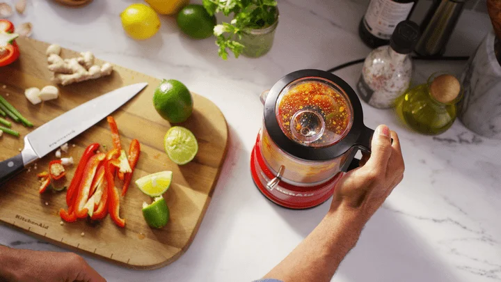 Malý, ale šikovný pomocník do single kuchyne na prípravu čerstvého jedla každý deň - KitchenAid Mini Food Processor s objemom 830 ml.