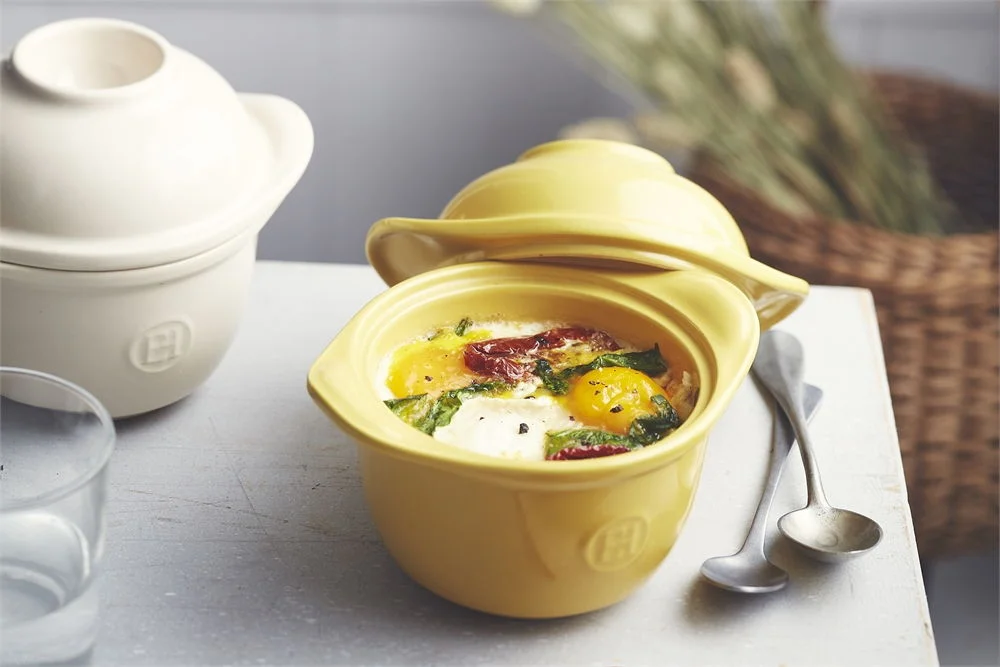 Obojstranne glazúrovaná miska s držadlami a vrchnákom s kalíškom na vajce je vyrobená z veľmi trvanlivej a odolnej keramiky Emile Henry Hight Resistance ©, a tak len nielen veľmi odolná voči poškriabaniu, ale tiež perfektne zvláda teplotné šoky. Môžete ju z mrazničky postaviť do rúry, prihriať v mikrovlnnej rúre alebo na platni a pripraviť tak večeru či prekvapenie pre návštevu raz-dva.