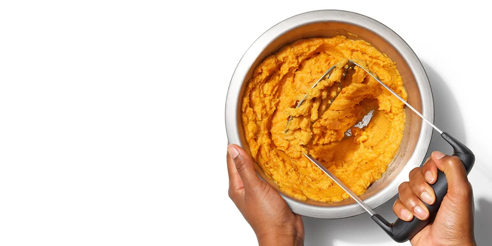 Pretláčadlo na zemiaky je z kolekcie Good Grips, a tak nie je prekvapením, že veľká pozornosť bola venovaná rukoväti. Mäkká, široká, vodorovná rukoväť s protišmykovou úpravou skvele padne do každej ruky - malej aj veľkej. Umožňuje tlačiť priamo dole a aj s minimom sily roztlačí veľké množstvo zemiakov naraz. Vďaka jemnej nehrdzavejúcej mriežke pripravíte dokonale hladkú kašu bez hrudiek. Vyskúšajte kašu nielen zo zemiakov, ale aj z batatov, mrkvy alebo inej koreňovej zeleniny. Len niekoľkými pohybmi pripravíte i domácu detskú stravu. Pretláčadlo na zemiaky sa ľahko čistí, umývať ho môžete aj v umývačke riadu.