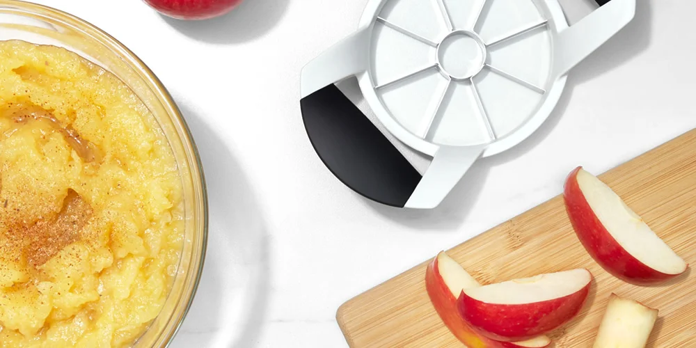 Krájač na jablká a hrušky OXO z kolekcie Good Grips jedným pohybom zbaví ovocie jadrovníka a rozdelí ho na 8 rovnako veľkých častí. Má dokonale ostrú čepeľ, takže stačí minimum sily. Dômyselne vyvýšené rukoväte ochránia kĺby pred nárazom do pracovnej dosky. Navyše majú ergonomický tvar a protišmykové prvky, takže sa nešmýkajú ani v mokých rukách.