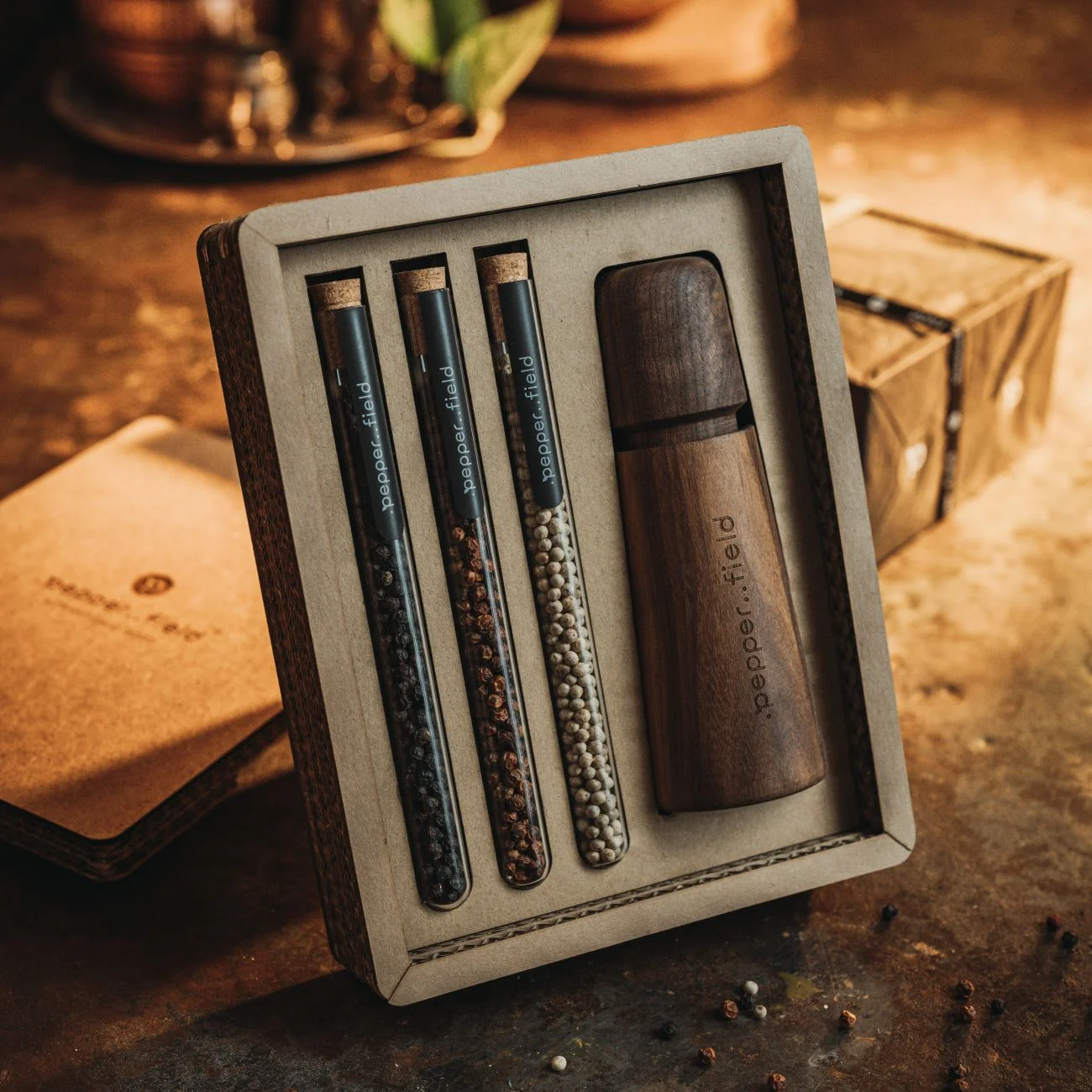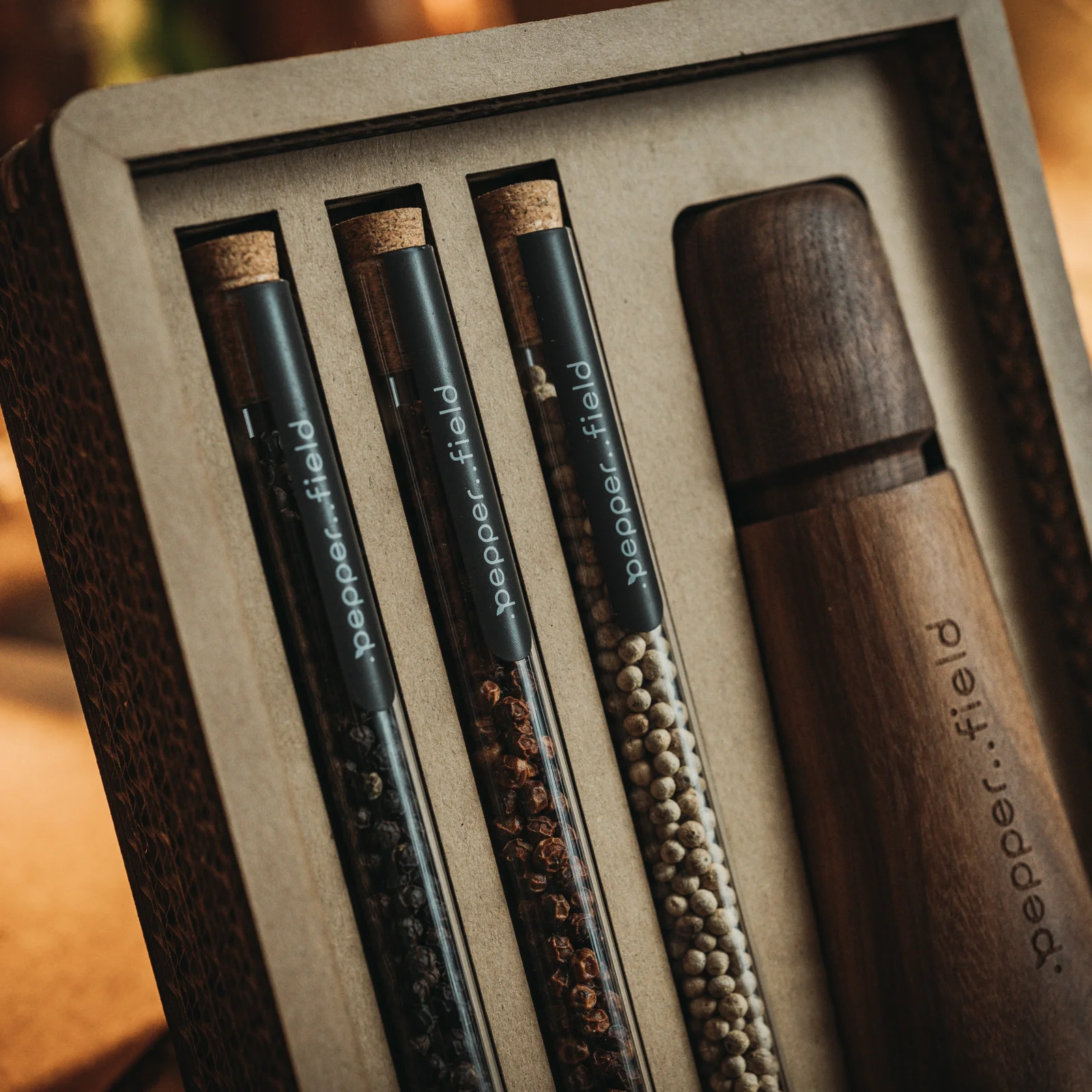 Darčeková sada sa skladá z dreveného mlynčeka v škandinávskom designe a troch sklenených skúmaviek s čiernym, červeným a bielym kampotským korením od značky .pepper..field®. Toto darčekové balenie tak v sebe spája exkluzívnosť, kvalitu a udržateľnosť.