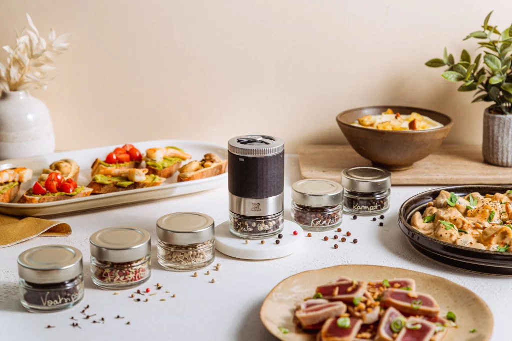 Sada troch sklenených dóz s vekami, ktoré slúžia ako vymeniteľné zásobníky korenia pre mlynček Maestro, je dodávaný aj s popisovčom. Všetko patrí do konceptu Maestro francúzskej značky Peugeot.