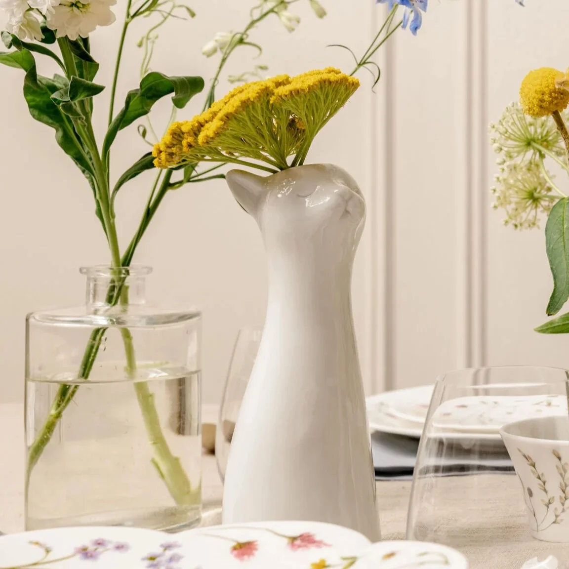 Realisticky vyvedené, avšak súčasne štýlovo veľmi jednoduché porcelánové vázy, z ktorých prinajmenšom dve humorným spôsobom evokujú jarný a veľkonočný čas. Ich snehovo biela farba len zvýrazní veselé a žiarivé farby jarných kvetov a pučiacich vetvičiek, ktoré do nich umiestníte, bez toho, aby tlmili ich kúzlo. Vtipné prevedenie každej z váz osvieži akýkoľvek interiér sám o sebe. Vázy v tvare zajačej alebo husej hlavy či sediacej mačky sú k dispozícii v dvoch prevedeniach, ktoré sa líšia len výškou.