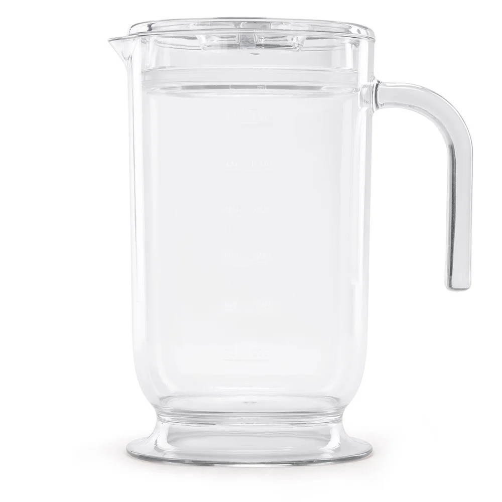 Esteticky veľmi podarená nádoba z odolného Tritanu™ s objemom 1,4 litra pripomína dizajnový džbán. Môžete ju tak používať aj na priame servírovanie. Jej súčasťou je vrchnák so silikónovým tesnením, takže ju môžete používať nielen na vlastnú prácu, ale tiež na bezpečné skladovanie v akejkoľvek polohe. Mierka na oboch stranách v ml / oz. Vrchnák aj džbán je možné bez problémov umývať v umývačke riadu.