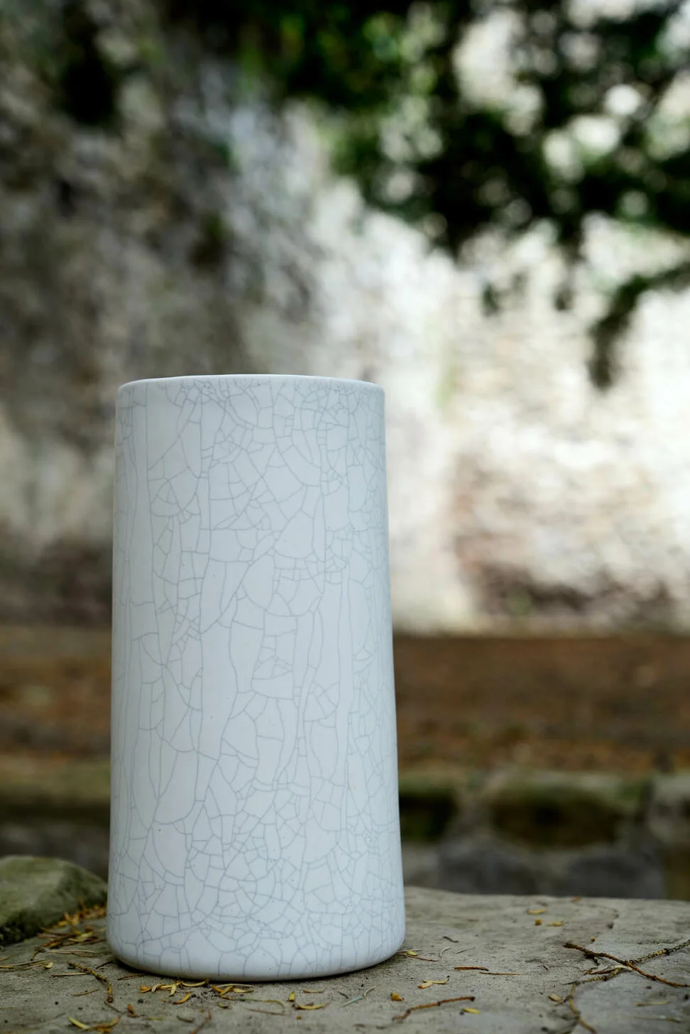 Veľká váza jednoduchého elegantného tvaru z francúzskej kameniny Jars. Saténovo-biela glazúra spoločne s mramorovaným efektom a na prvý pohľad viditeľná ručná práca robí z tejto vázy výnimočný kúsok. Váza vysoká 28 cm je vhodná najmä na veľké kytice na dlhších stonkách alebo rozkvitnuté jarné vetvičky.