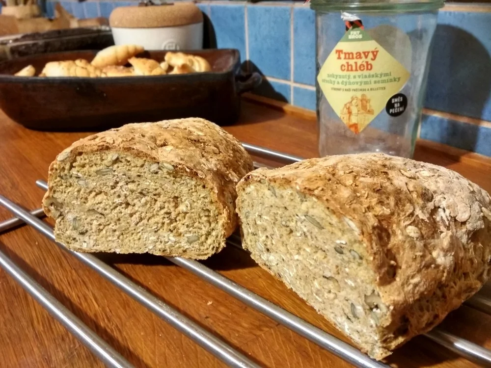Bez syntetických konzervantov a umelých dochucovadiel. Vynikajúci, nekysnutý tmavý chlieb s orechmi a tekvicovými semienkami, ktorý si sami upečiete za 20 minút. Do zmesi stačí pridať cmar a máte hotovo. Perfektné tiež ako darček pre všetkých, ktorí radi pečú a chýba im na to čas. Zmes na pečenie je uložená v praktickej, uzatvárateľnej sklenenej dóze.