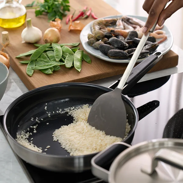 Odolný keramický povrch je vyrobený bez PFAS a zaručuje optimálny výkon pri jemnom varení rýb, zeleniny a pokrmov s vajíčkami. Urýchľuje tiež čistenie panvíc.