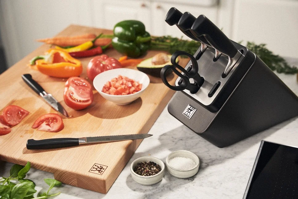 Predstavte si, ako dokonale ostré nože dodajú vášmu vareniu úplne nový rozmer – so samoostriacim blokom solingenskej značky Zwilling je to možné. Exkluzívny set obsahuje päť špičkových nožov z prémiovej série Four Star v puristickom designe bezškárovej rukoväte a multifunkčné nožnice Twin L, ktoré spoločne predstavujú základné vybavenie vašej kuchyne.