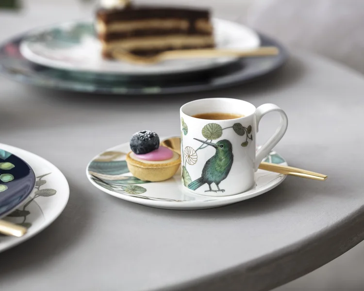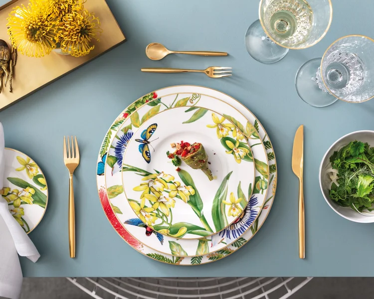 Nevšedné motívy nájdete aj na porceláne Amazonia od Villeroy & Boch, ktorého dizajnéri sa pre zmenu inšpirovali cestovaním svetoznámeho prírodovedca Alexandra von Humboldta po južnej Amerike. Riad preto zdobí zeleň a kvety dažďového pralesa, poletujúce motýle a kolibríky.