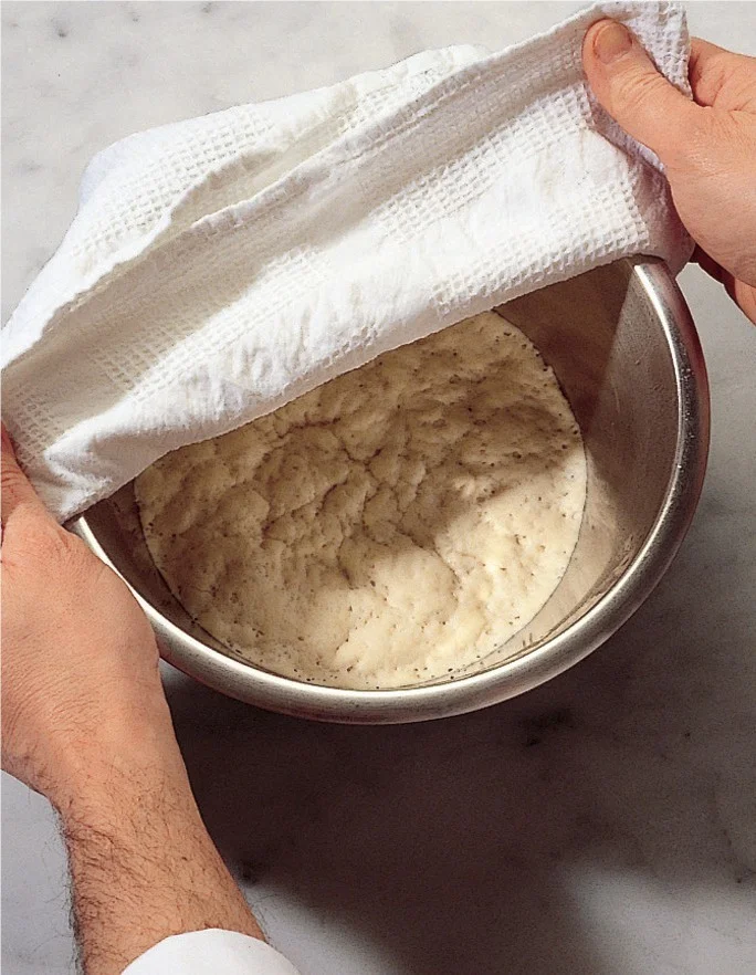Povrch cesta potrite olejom, ktorý ho chráni pred vyschnutím. Účinok zvýšite prekrytou vlhkou utierkou, alebo ako v tomto prípade potravinovou fóliou. Chlieb bude ešte aromatickejší, keď cesto potriete olivovým olejom extravirgin.