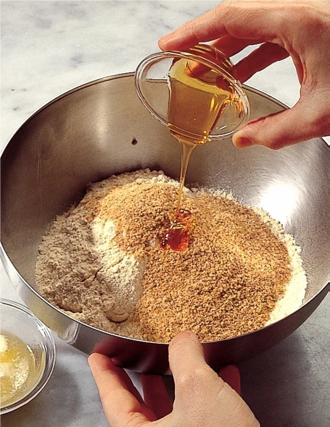 2. Potom dajte do inej misy a pridajte zbytok múky, droždie, múku z tvrdej pšenice, pšeničné klíčky, slad, zohriate maslo a mlieko na teplotu 28 – 30 °C.