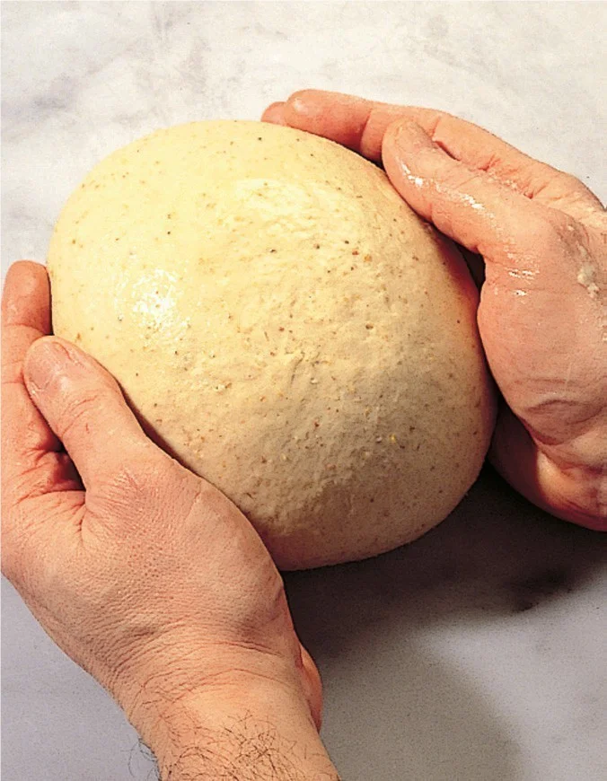 4. Z cesta vytvarujte veľkú guľu, povrch potrite olejom a ľahko vmasírujte aj dnu. Potom dajte na tanier, prekryte potravinovou fóliou a pri teplote 28–30 °C nechajte odpočívať 25 – 30 minút. Ak je izbová teplota nižšia, vložte cesto do trúby predhriatej na požadovanú teplotu.