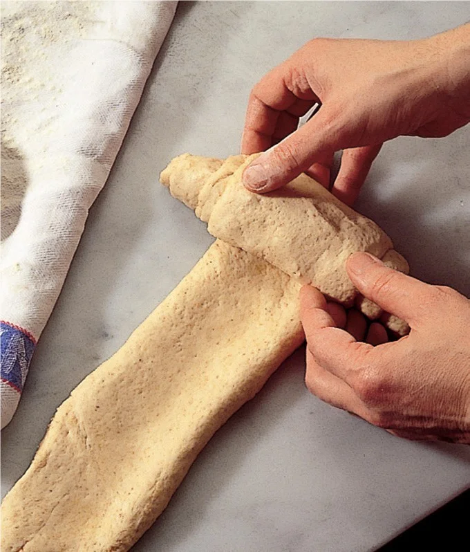 5. Ďalej cesto rozdeľte na dve polovice, ktoré ľahko rozvaľkajte a zrolujte. Opatrne položte s koncovou časťou dole na dosku s múkou a 20 minút nechajte kysnúť. Následne preklopte na plech s papierom na pečenie, tak aby koncová časť s múkou smerovala hore, a nechajte kysnúť ďalších 40 minút. Dajte piecť na 250 °C, po 10 minútach znížte teplotu na 190 °C a pečte ďalších 15 minút.