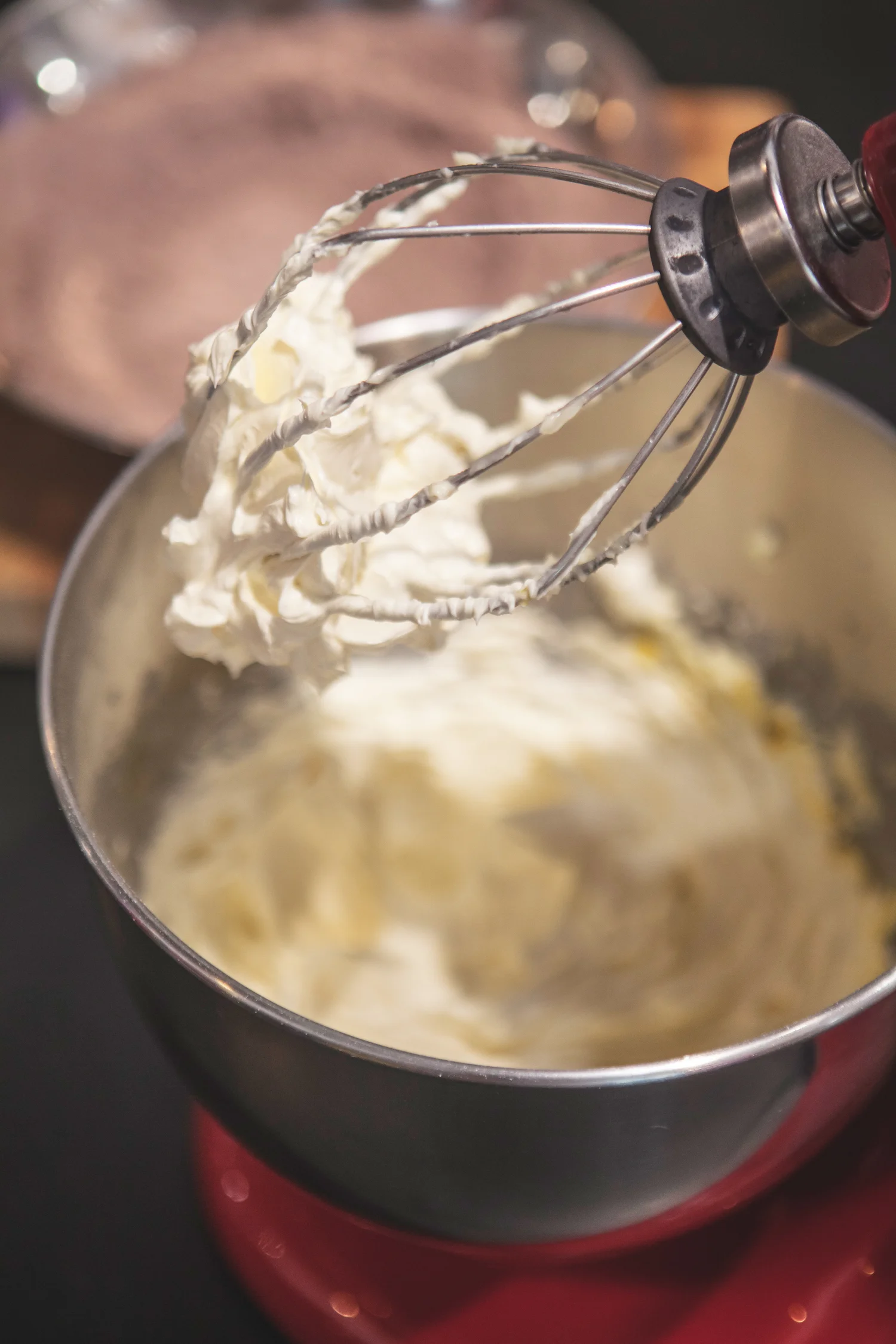 3. Do maslovej peny prišľaháme vajcia a potom ručne pomocou gumovej stierky zamiešame preosiatu a premiešanú suchú zmes (kakao s múkou a rozmarínom).