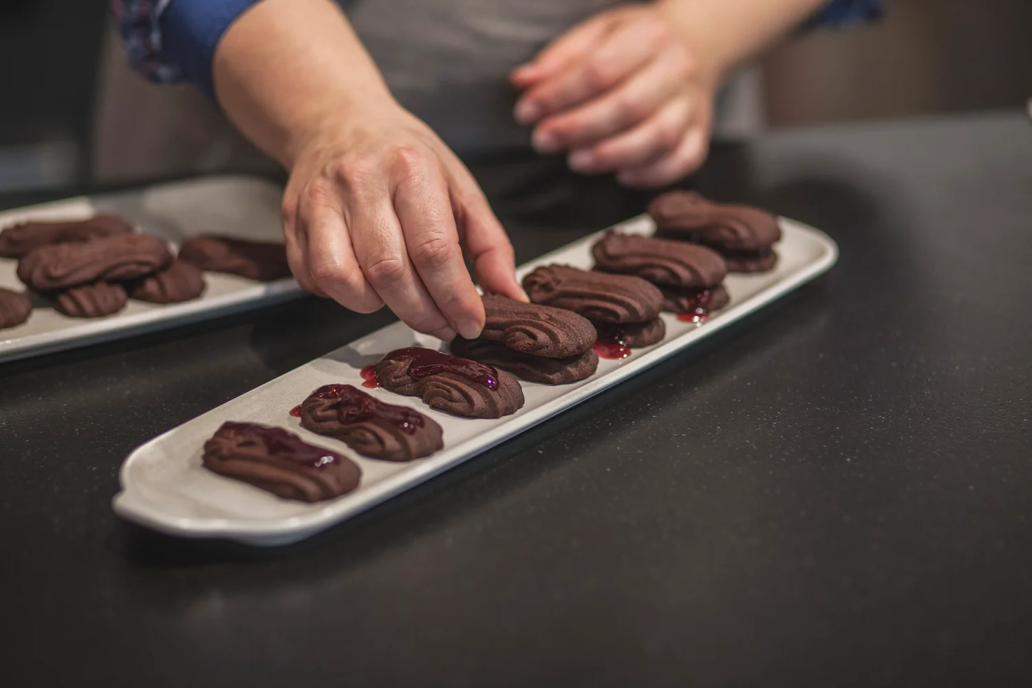 K sebe zlepujeme sušienky višňovou marmeládou.
